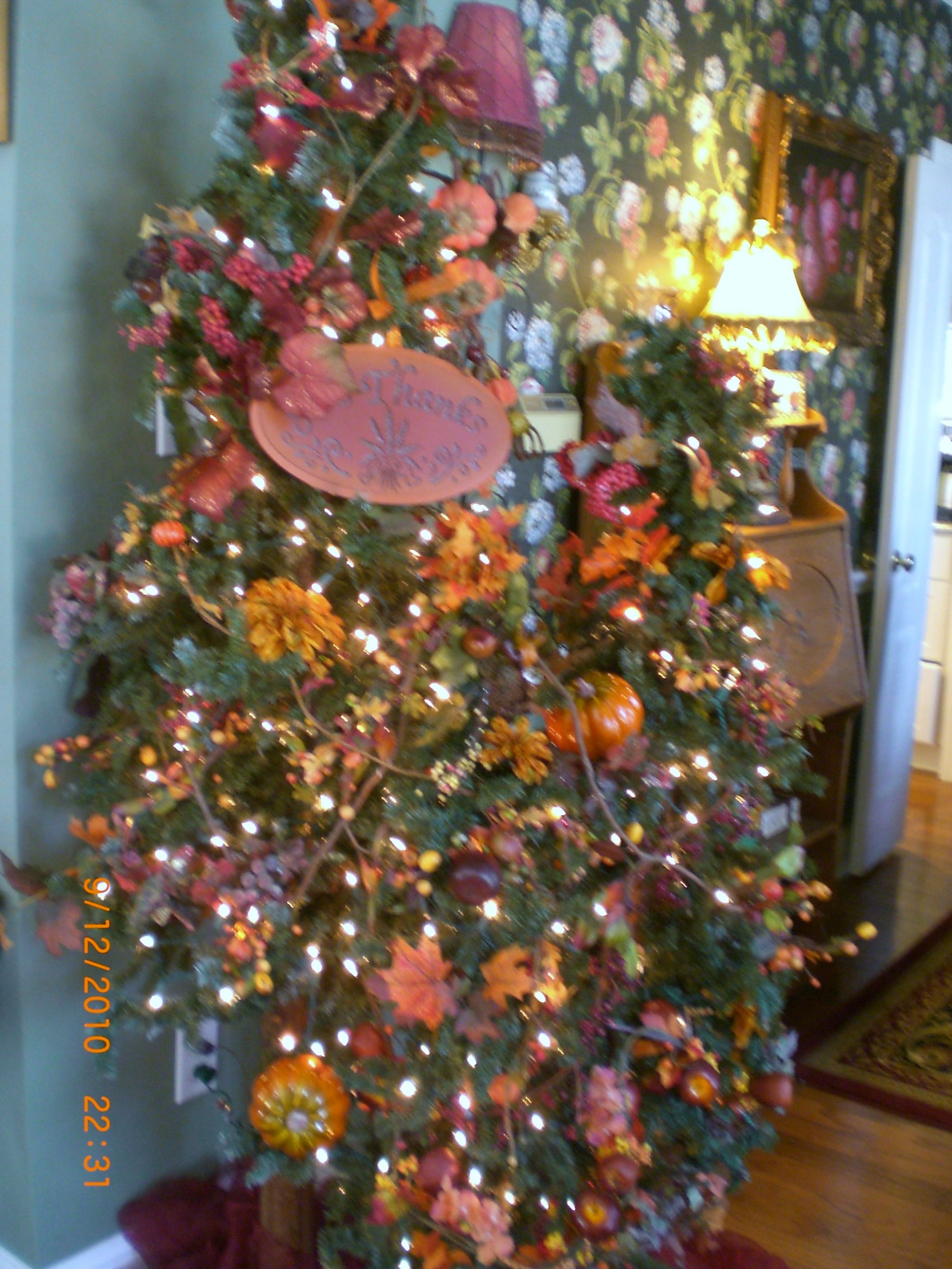 So beginning in September, we put up Fall trees, which turns to Christmas trees the day after Thanksgiving. I have promised sweet little Peter Pumpkin that I will make lots of pumpkin bread to sell to help pay our electric bill.