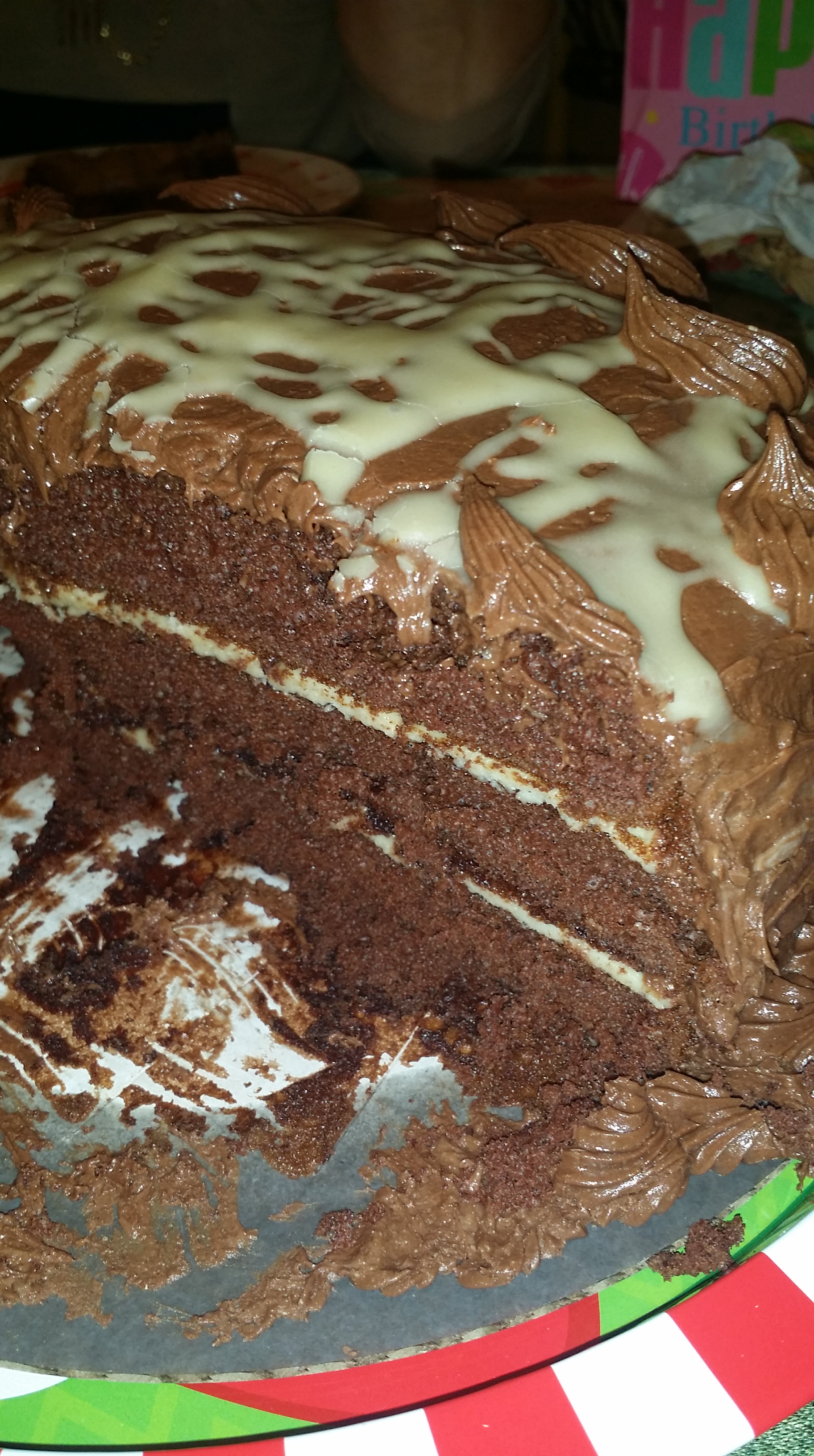 Last evening we were invited to a birthday dinner for my BFF here in Dallas. One of Cora’s favorite things is to stand in my kitchen and eat my praline frosting with a spoon straight out of the pan. She also loves chocolate cake, so I thought about it and decided to combine her two favorite flavors into one big chocolate cake with praline frosting. The inside layers of frosting were the praline and the outside was covered with a great chocolate cream cheese frosting. The results were amazing.