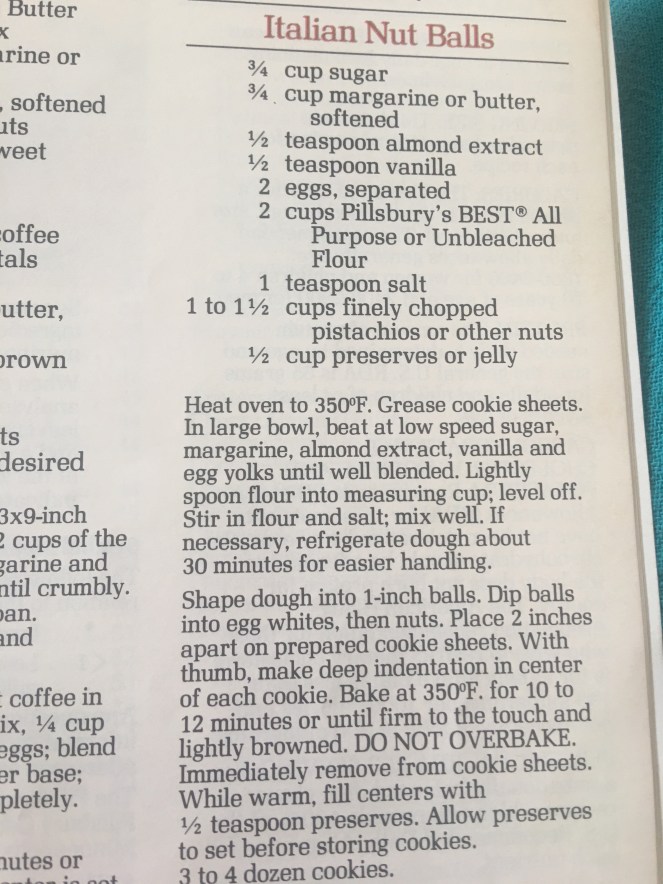 So in the meantime, think I’ll bake these little gems and pack them in my suitcase to snack on while flying to Italy! Will help me remember why we are doing what we are doing……because we truly are Italian Nut Balls!!! taken from a Pillsbury Cookie Cookbook 1987