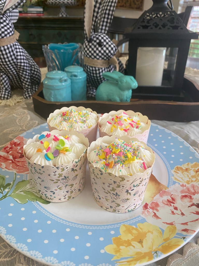 Only 10 days until Easter, the holiday Christians celebrate Christ Is Risen!! Giving us new life and life eternal! And as so many of us will be gathered around the table with family and friends, it will be glorious to share not only this most special event, but time with people we love so much! So these days leading up to Good Friday and Easter Sunday I thought it would great to post some favorite Easter dishes! Tomorrow I have a sweet lady coming over for us to make one of my favorite desserts, Pistachio Cake! We will put it on video to show how easy and pretty this cake is and could easily be made into cupcakes instead of layers! But today a friend is stopping by and because I know one of her favorite flavors of cake is wedding cake (and mine as well) and because I got a new tip to decorate with, I mixed up some cupcakes for us to snack on while we talk! Makes visits so much more fun! Visits & Cupcakes!!! My kind of day!!! So here is the recipe and don’t forget to use some spring colors in the batter to make it a colorful yummy cupcake! Top it with frosting and top with colored coconut or sprinkles of your choice! These cupcakes are light pink with white frosting!