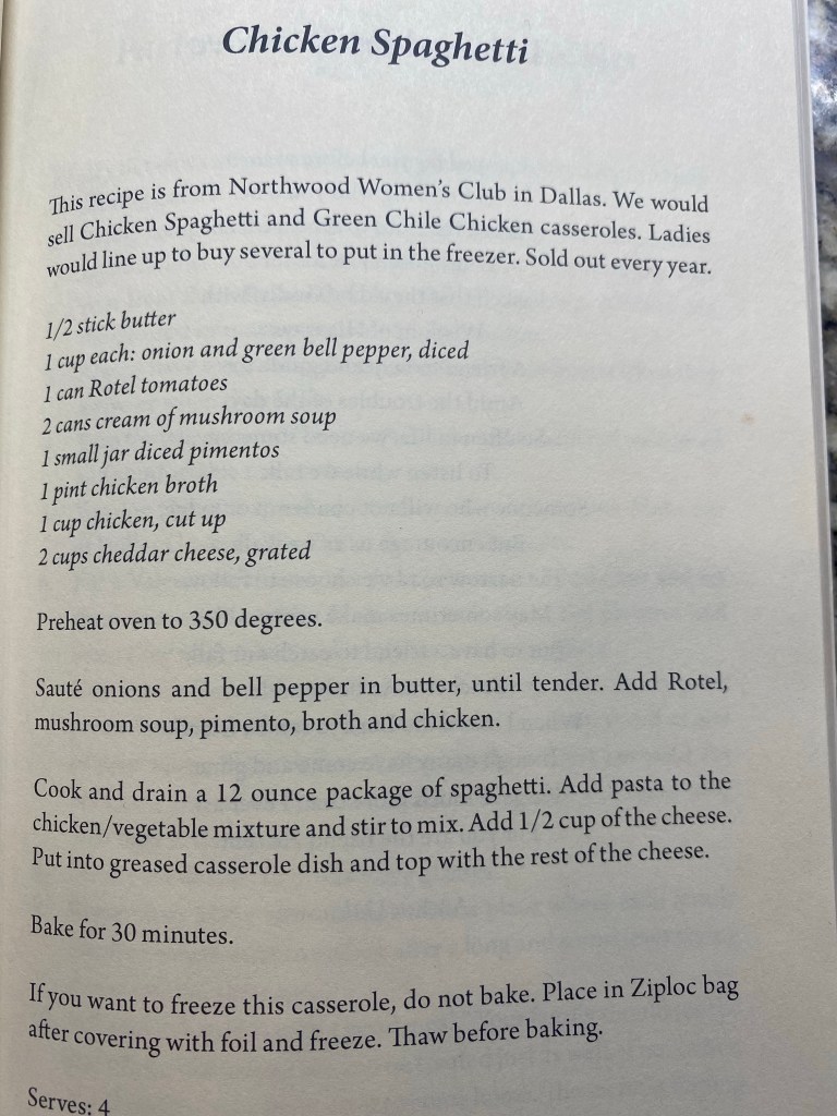 If you have a copy of Princess On The Porch, this recipe is on page 29! If not I am posting this easily made dish that is perfect for freezing for when you might need a night of not having to think about what to have and tired of eating out! This casserole use to sell like “hot cakes” at the NorthWoods Womens bake sale! Also sold a few hundred of them when friends and I hosted Mistletoe Market from our home! I got home around 3:30 today and needed a quick meal to make for tonight. Since I had bought a chicken at Costco Sat and had divided it into bags before freezing it, I had taken one bag out to thaw this morning before leaving. This one is a keeper! And now I have time and energy left to make a buttermilk pie for dessert! An added hint….I usually boil my spaghetti in water that I have either added some chicken boullion to the water or added 1 (14.5oz) can of chicken broth to the water you cook the pasta in, giving pasta some added flavor. But remember then to not add salt to your pasta water!