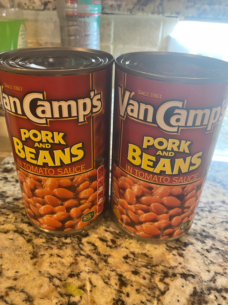 Cup up the ends of a lb of bacon (u know the end that is simply fat and no meat) and fry the bacon pieces with the veggies! or if you are not a bacon lover, You can fry these veggies in …what am I saying? Use the bacon for Pete’s sake and worry about your cholesterol in 2023! Sauté veggies until tender! Pour veggie mixture with bacon grease from pan into a bowl. Pour 2 (28 oz) cans of Campbell pork and beans in bowl! Add 1 tables Worcestershire sauce with 1 cup light brown sugar, 1 cup of catsup and almost ( about 3-4 tables)1/4 cup of mustard. Mix well and pour into a Pyrex baking dish. Place a few more ends of bacon over the top and cover in fridge until ready to bake. The bacon will cook and the flavor will seep down into the beans for a wonderful rich flavor.