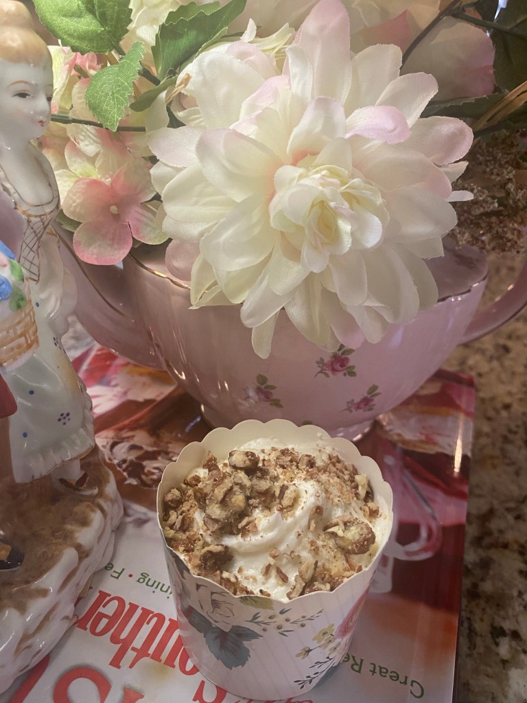 Needing to bake a few things for some people this week, I remembered that one of the friends I was baking for loved this Butter Pecan Cake Mix that I find at Market Street. Followed the instructions in back of box except I used milk instead of water! Then for frosting I made a bowl of cream cheese frosting and topped them off with crushed Praline Pecans from Costco! These are great gifts and made quite the hit. Bake cake or cupcakes as directed in back of box. The Pralined pecans add such a rich flavor to each bite!
