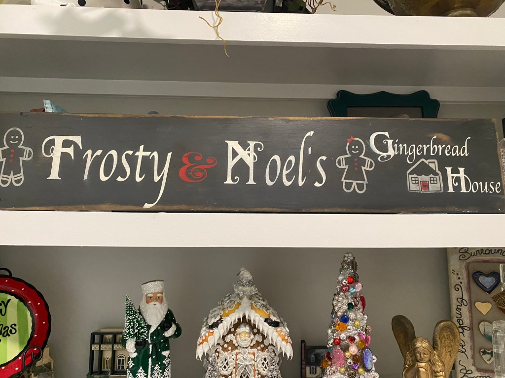 Many years ago Randy and I decided to find a way to further embarrass our kids and came up with a phone recording (back in the day when we had phone recorders) that went something like this: “Hi you’ve reached Frosty and Noel. We aren’t home right now. Frosty’s at the mall and I’m baking cookies, when he gets home we’ll give you a call.” the kids use to call our house and tell us not to answer the phone so they could show their friends how weird we were! So we have been Frosty and Noel for probably 25 plus years to friends and family. Our Christmas cards were even Signed like that and most of the cards we received were addressed to Frosty & Noel. We have carried a sign from house to house that we had made.