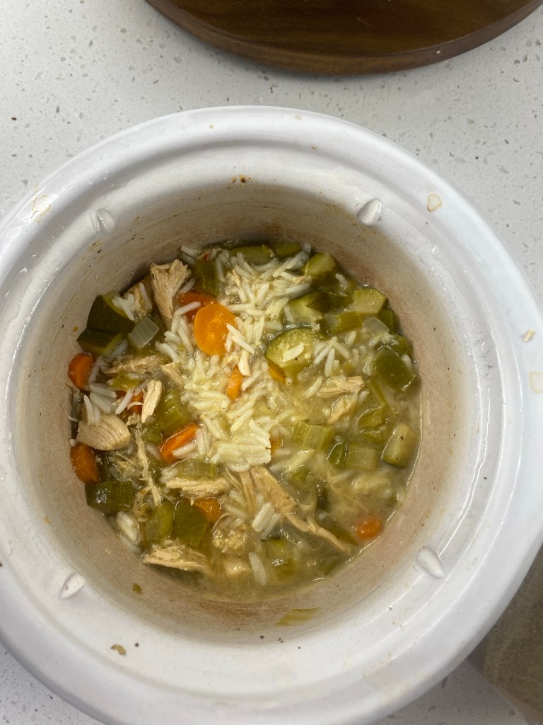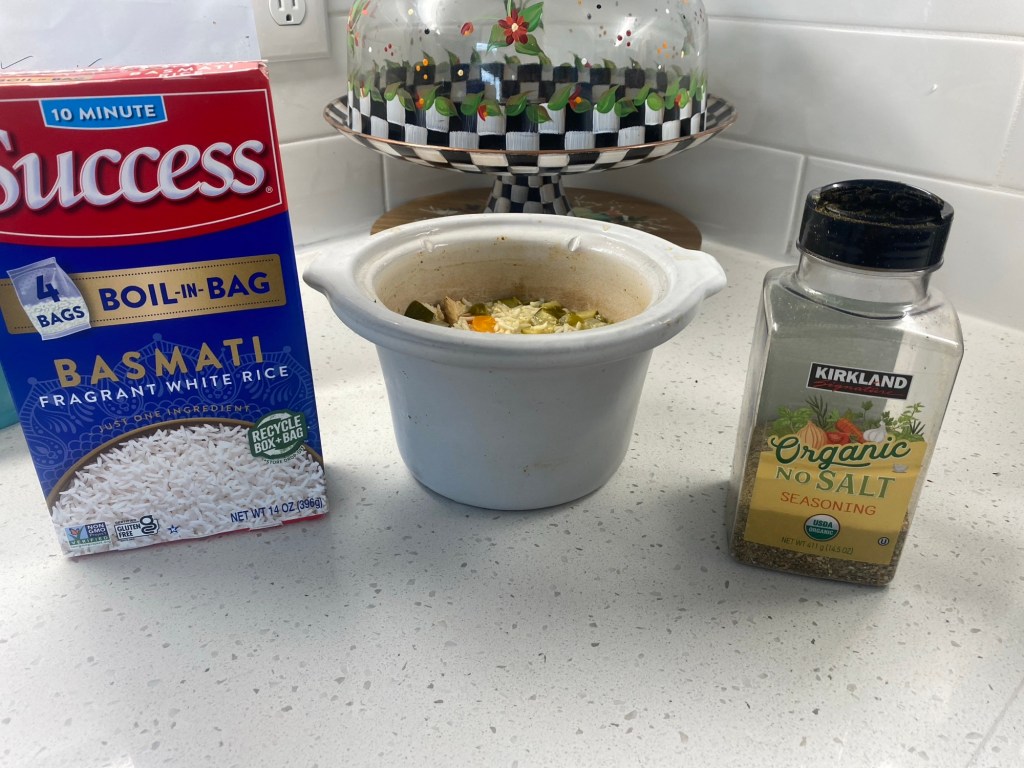 I used basmati rice from boil in bag and cooked it for 11 min! When ready to serve, place a spoonful of rice in the bottom of serving bowl and top with a ladle of the chicken soup over the rice! This is a very flavorful soup and we will have enough today for lunch. (The rest of the rice was added to the soup for our lunch today!)