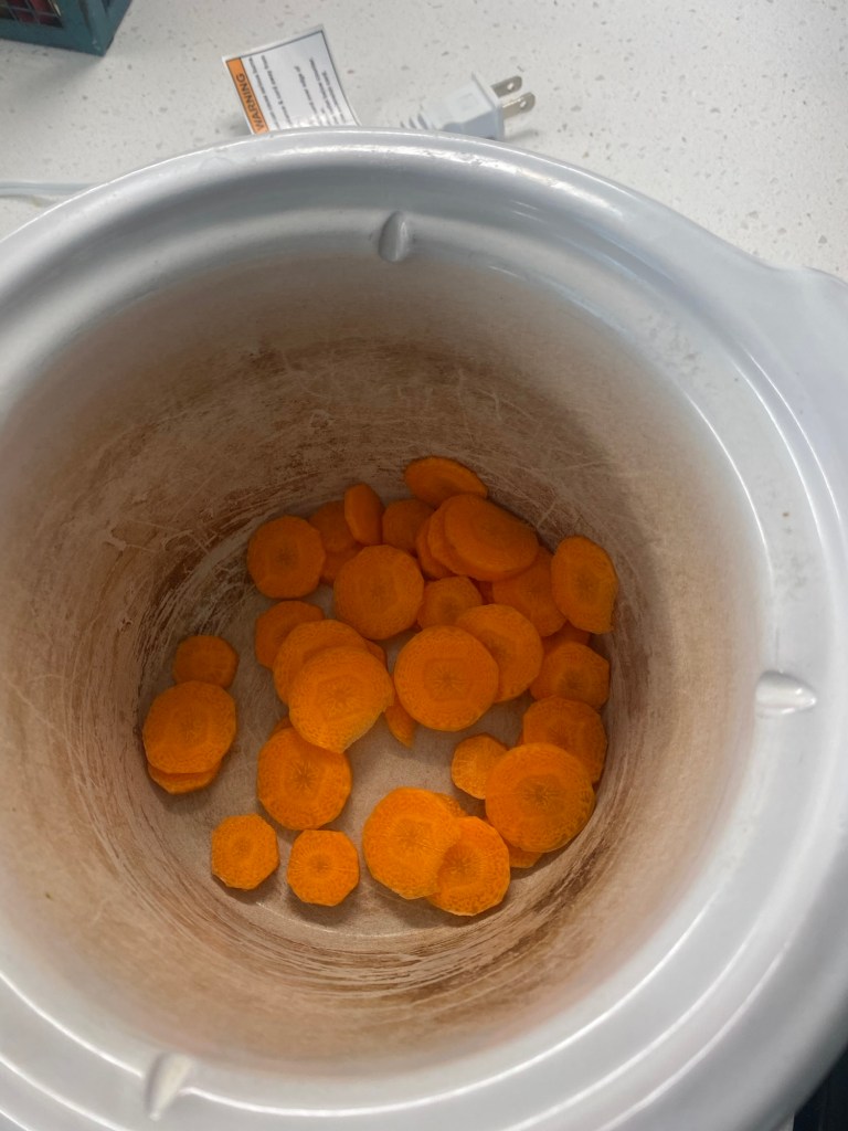 Pour chicken broth in crockpot. Place sliced carrot into broth. Add the potatoes/veggie ingredients to the broth. Cook on high for about 2 hrs or until carrot and potatoes are tender!