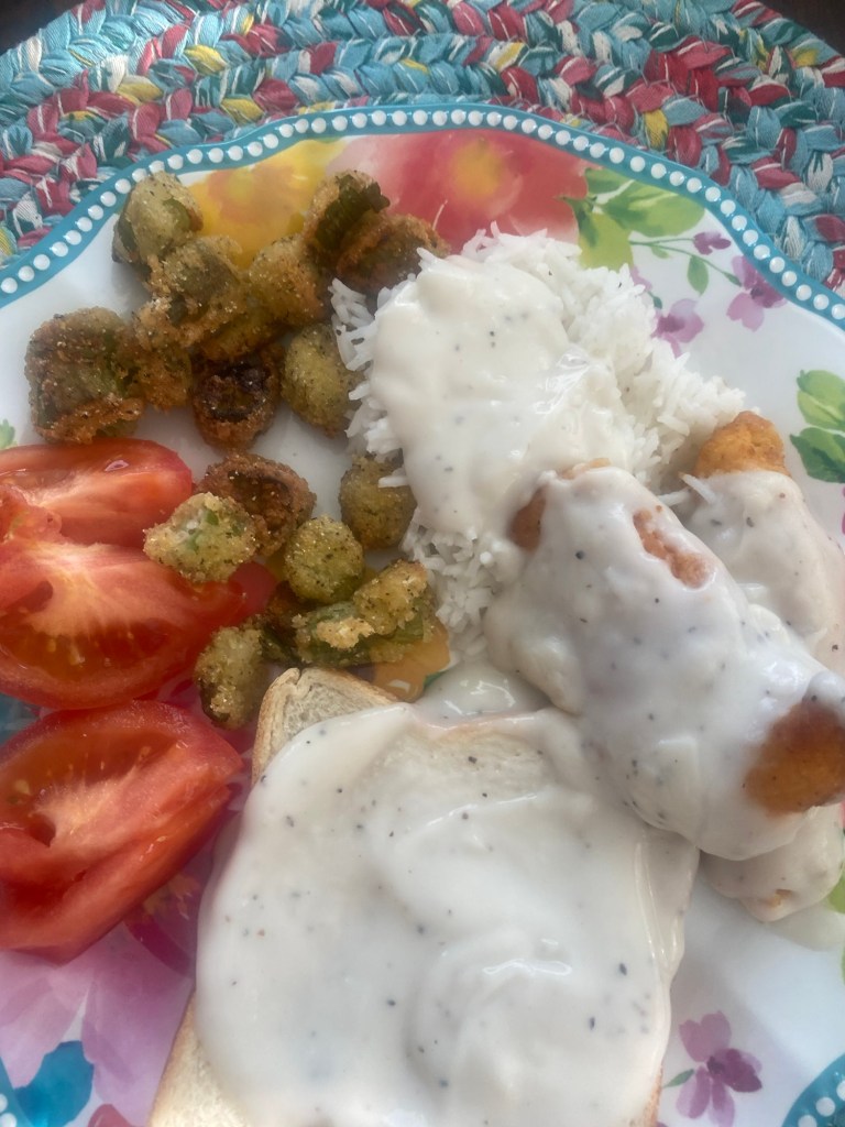 Avenida had a tea for the ladies a couple weeks ago and one of the ladies ask the group what were some of the things we rememebered from years past. Someone mentioned that they always had just plain sliced bread on the table at every meal, to which we all agreed that our homes had the same. Fast forward to today and when I was trying to figure out what to have for dinner, I remembered how good sliced bread always tasted with gravy! So tonight we relieved days gone by with fried chicken baked with gravy, rice and sliced bread with gravy, fried okra and a fresh tomato just because it made the plate look pretty! They didn’t have much flavor but added color to the southern meal! We both enjoyed the familiar flavor of just good ole sliced bread with gravy! Brought back so many memories….one of which was my mom always saying “Trudy K no more, you have already had 3 slices! You don’t need anymore!” And that is maybe why one of my nicknames was Ms Pleasingly Plump!