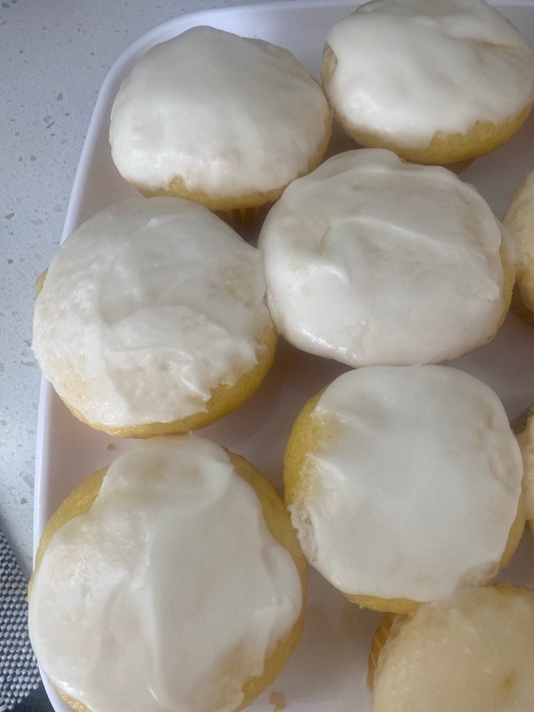 Using a medium cookie scoop fill greased mini muffin baking pan (mine holds 24 minis) half full bake In preheated 350 degree oven for about 12-15 min depending on your oven. Do not over bake. Take them out just when top is soft and doesn’t look dry ! Cool and pour glaze over top or dip each mini in the glaze. I ended up nuking the glaze until it was thin enough to pour but found it easier to dip the tops of the minis instead of pouring it over them. I did the same with the 12 regular size cupcakes that I made with the left over better.
