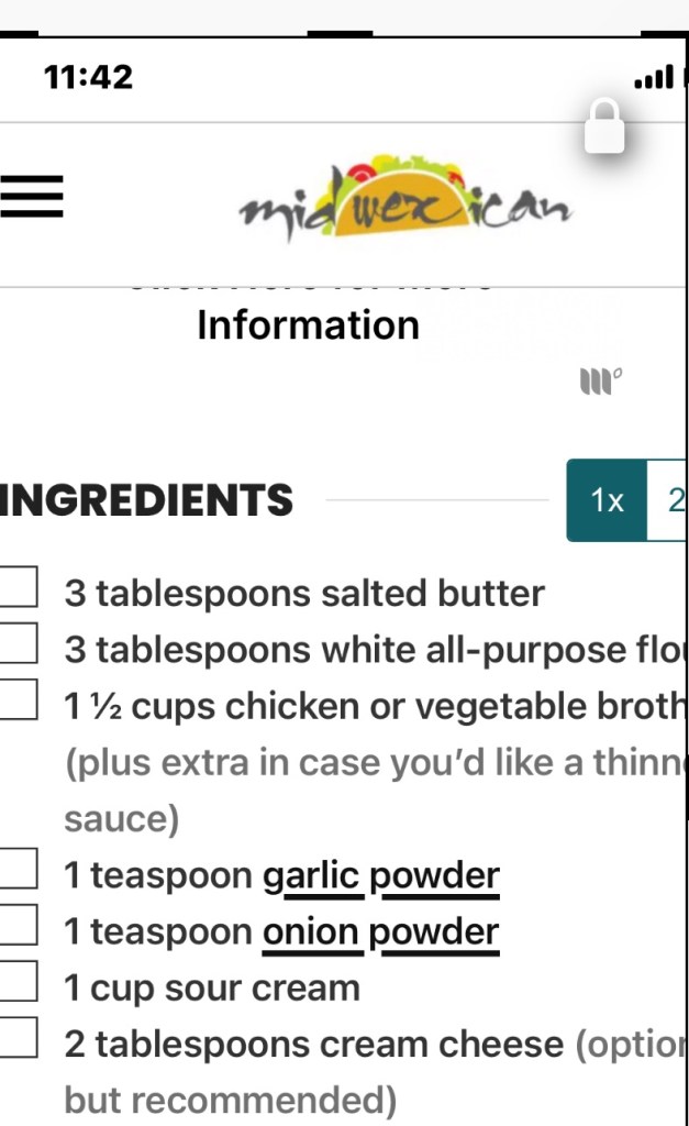 I made 6 enchiladas with shredded chicken from Costco and sautéed 1/2 white onion in a little butter with some Lawrys seasoning salt! Put a little of the chicken, onion mixture and a sprinkle of the Mexican shredded cheese inside a corn tortilla that I had seared in hot oil 2-3 seconds on each side! Placed the enchilada in a greased pan and covered with the sour cream sauce and topped with sharp cheddar cheese. Baked in preheated 350 oven for about 25 min or until sauce bubbled and cheese was melted ! Ole’.