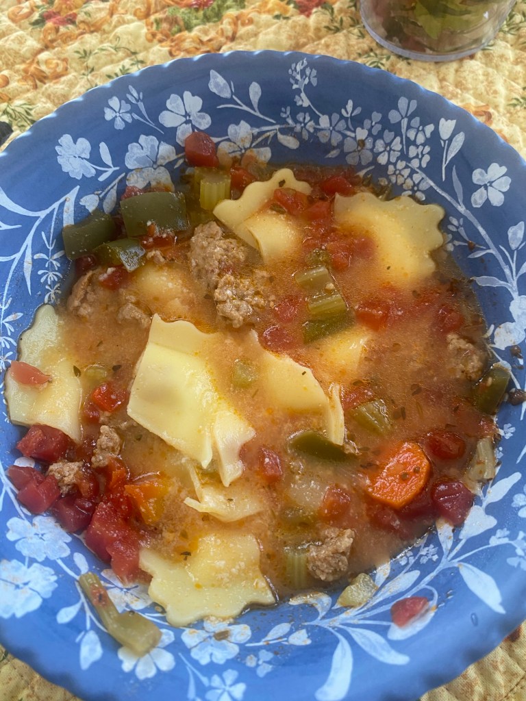 Sliced some garlic herb French bread, buttered the bread and warmed it in oven! Spooned up the soup and sat down to a bowl of wonderful Italian ravioli soup with garlic bread!