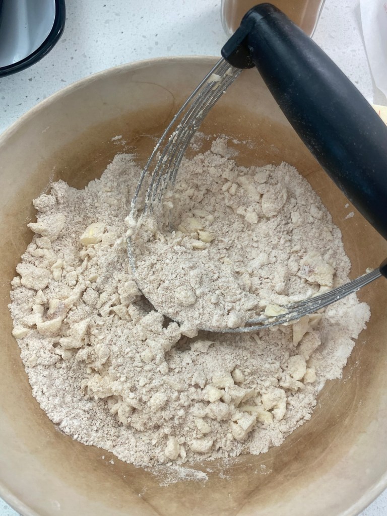 Using a pastry cutter, blend in the butter with the flour and sugar until mixture resembles coarse crumbs. set aside