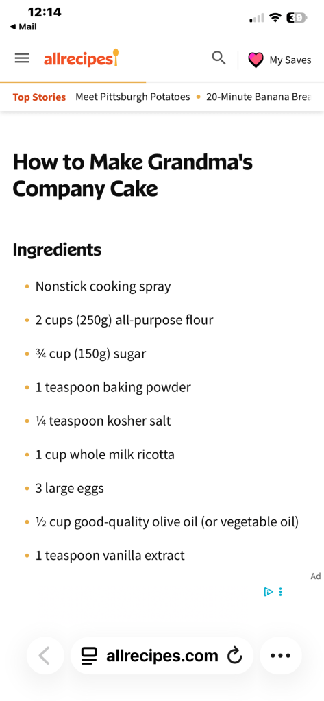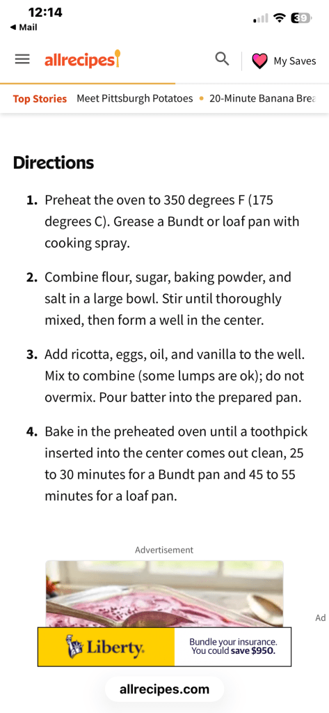 A sweet friend, Jerry and I have been exchanging recipes for years. A couple of days ago she sent me this recipe I just had to try! When she sent it, I, of course told her that she should have sent it the day before when i was making grocery list to be delivered a couple hours before she sent it so I wouldn’t have to run to the store to buy ricotta in order to make it! She replied with “well I thought for sure that TKBakesalot would have everything needed on hand”! And that is how we communicate all the years we have been friends! it is fun and makes us both laugh at each other! And she has given me lots of great recipes throughout the years! Well, I didnt have to go to the store! a sweet friend that lives here at Avenida, just had some knee surgery and I went to visit her a couple of hours after Jerry sent me the recipe. I took a copy of it to show her and I said ” doesn’t that sound good” ? (She loves to bake as much as I do). I told her that as soon as I bought ricotta, I was going to make us some and I would share with her to which she replied “trudy I have a whole container of ricotta in the refrigerator that I had bought to make ricotta cookies but I never got them made because of the knee surgery please take it home with you and use it.” What angel! So I did just that! I took it home and made two loaves, one for us and one for Jerry! I shared mine with Mary (the ricotta friend) an took Jerry hers so she now owes me big time! It is always fun to have her owe me! Allows me to be able to ask her favors! to be honest I could’ve bite of it when it came out of the oven and I didn’t really think too much about it but as it cooled and instead of wall it was really a good cake it’s a perfect cake to have with a cup of hot tea or a cup of coffee, or in my case, a diet Dr Pepper! I did use almond extract instead of vanilla and added crushed almonds over the top before baking it! sprinkled powdered sugar on top about 15-20,min after taking it from the oven! Directions said 25-30 min but mine took 40 min before testing done. ( i made mine in a loaf pan). Thank you All Recipes and Jerry!! I better get busy making the ricotta cookies now for Mary!