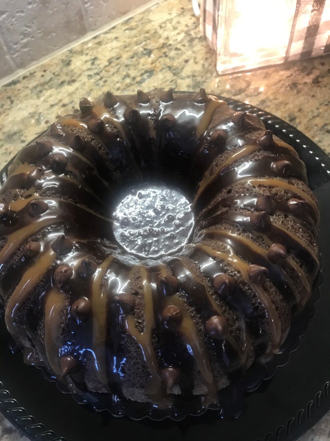 Using a good brand of caramel ice cream topping, place about 1/2 cup of caramel in the microwave oven for about 12 seconds. Drizzle the caramel over the cake. Then when it has set for a few minutes, Drizzle some of the chocolate frosting glaze over the cake in-between the caramel drizzles. Sprinkle more chocolate chips if desired onto the top of the cake.