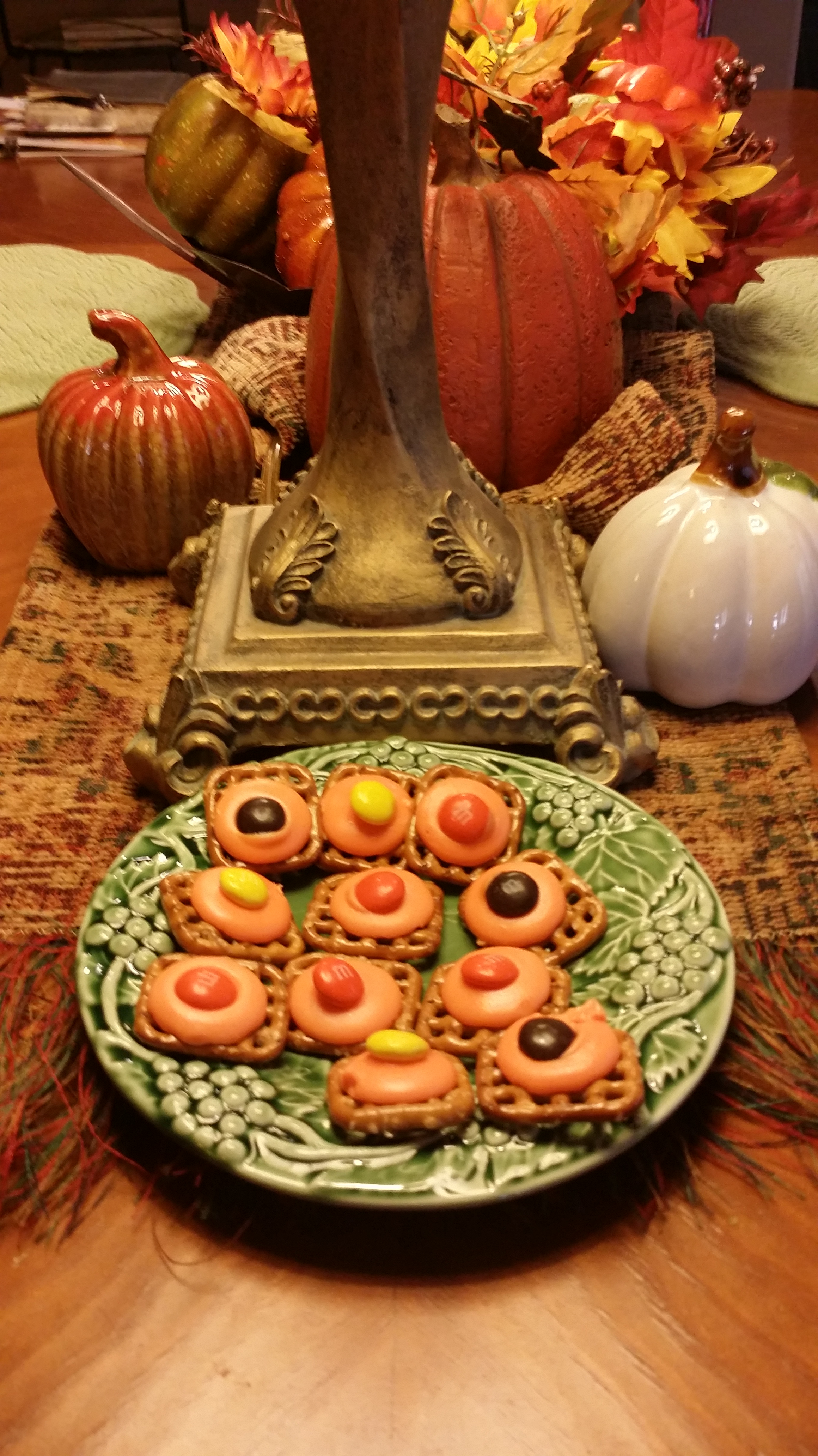 So far, I have not been able to find any Fall colored M&M’s yet, so just picked out the brown, yellow and orange ones from the bag I had. I posted these a couple of years ago and for some reason, did not make them last year. Probably because I knew if I did, I would be admitted to the 1800chocolatehoarders. But folks, this has been a tough year. Learning how to live in a house with a newly retired husband, well…let’s just say that I have earned every bite of chocolate I can get my hands on. It is so weird that I don’t even really like pretzels, but when you put chocolate on them, they become a whole new food group to me.
